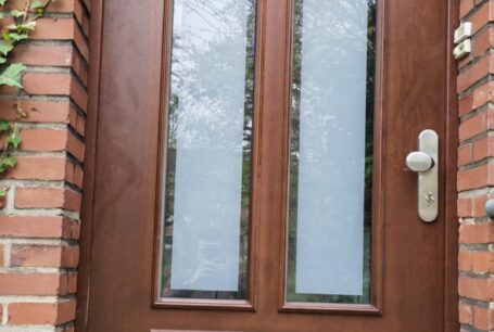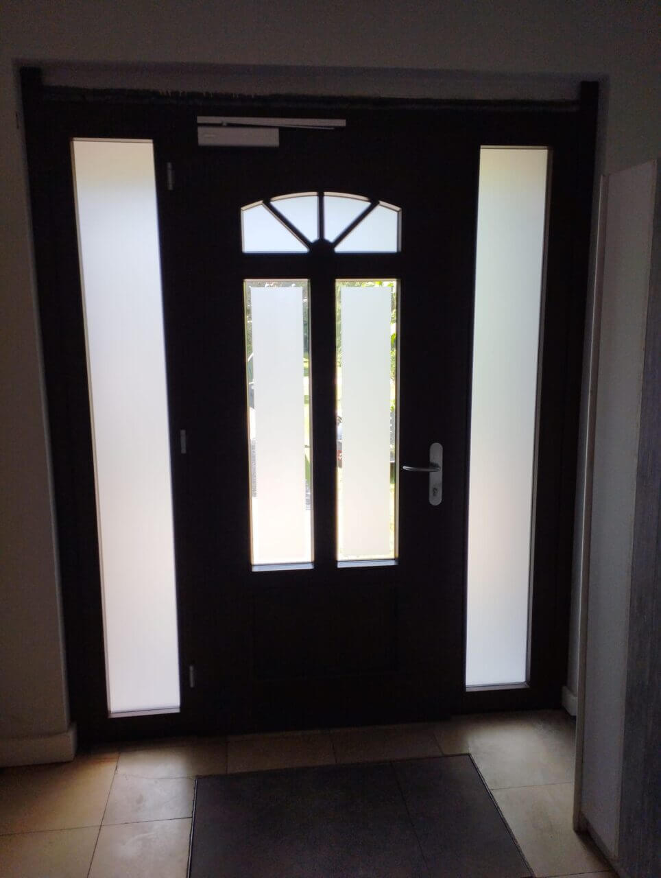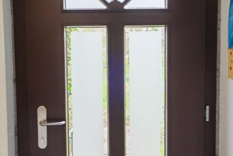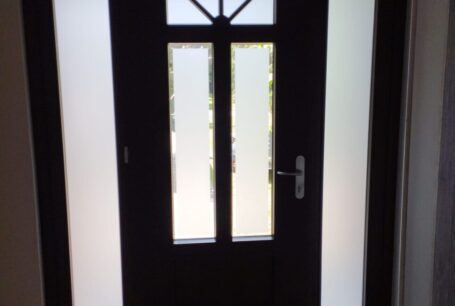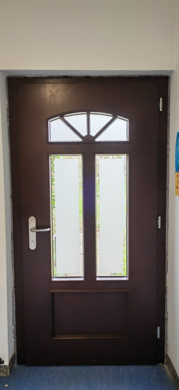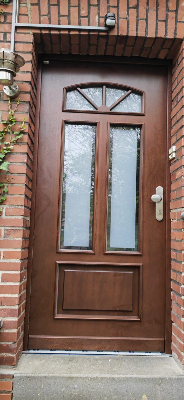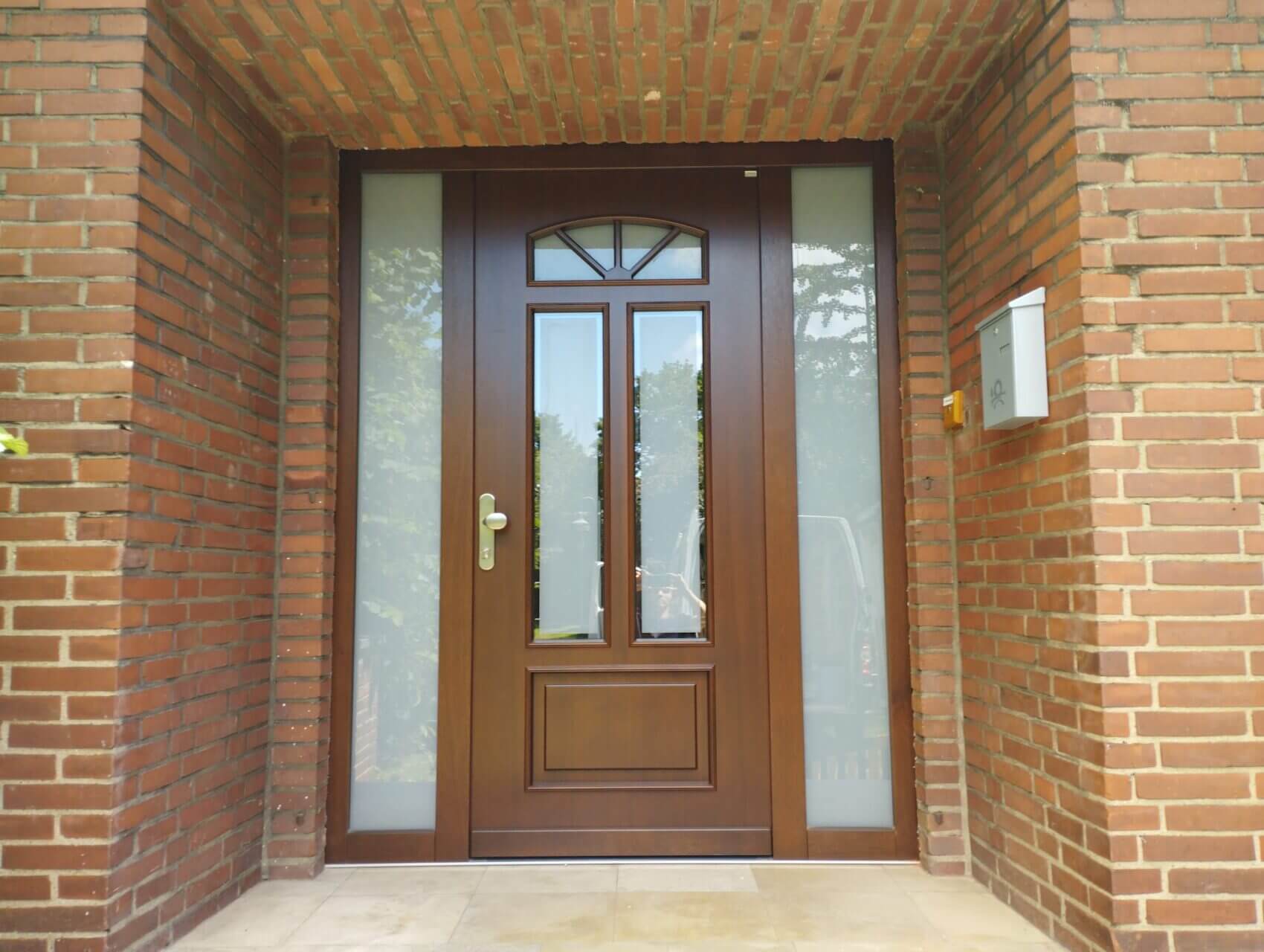 Haustüranlage: Massivholz, Sicherheitstechnik, Isolierglas (satiniert mit klarem Rand), Kassetteneinsatz, Zierleisten, etc. ...