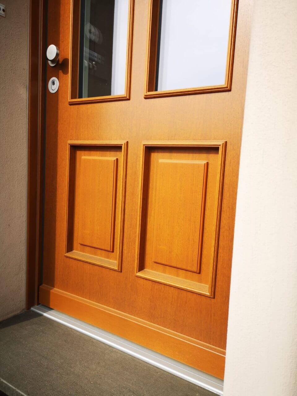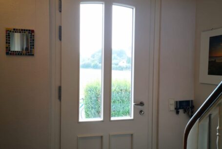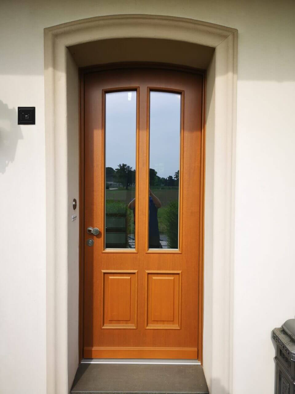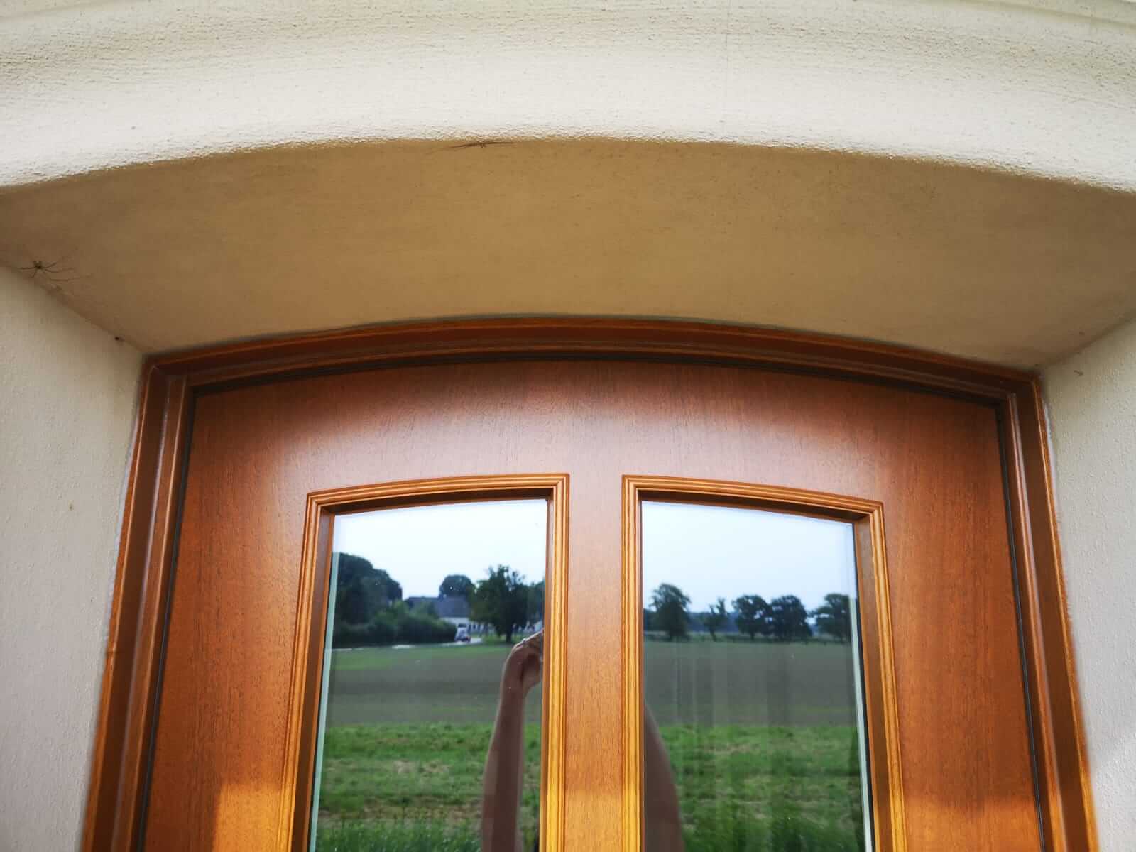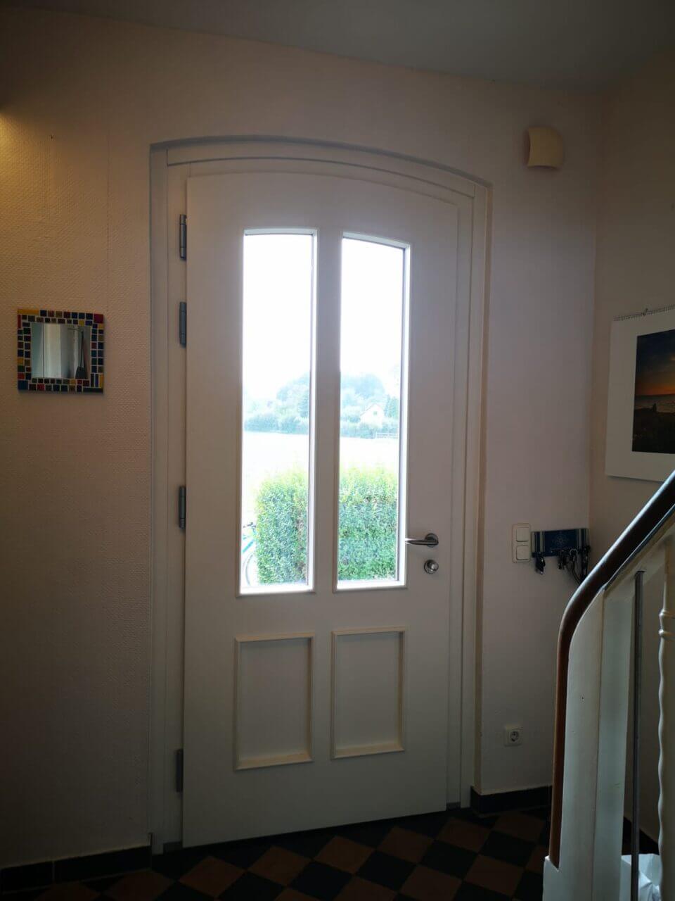 In traditioneller Optik aber in modernster Qualität erhielt das alte Bauernhaus unserer Kunden eine adäquate neue Haustür. Massivholz mit verdeckter Stahleinlage, 3-fach-Sicherheits-Verriegelung, aufbohrgeschützter Profilzylinder mit bündiger Rosette, alle Beschlagteile aus rostfreiem Edelstahl, teilweise mit Isolierglas, teilweise mit geschlossener Füllung, traditionell verziert und dem gemauerten Bogen der Wand perfekt folgend - so zeigt sich der Hauseingang wieder einladend und sicher. Dank höchster Ansprüche in Sachen Einbruch-, Schall- & Wärmeschutz trotzt diese Tür nicht nur Wind & Wetter, sondern auch dem Straßenlärm und ungebetenen Gästen. Innen ersparen unsere angepassten Deckleisten weiteren Renovierungsaufwand.