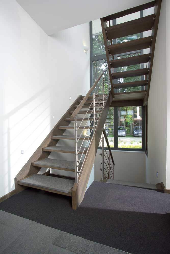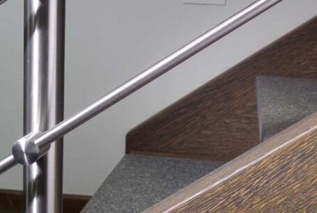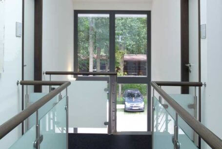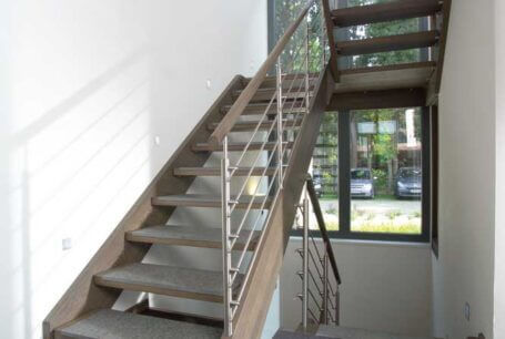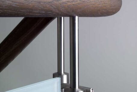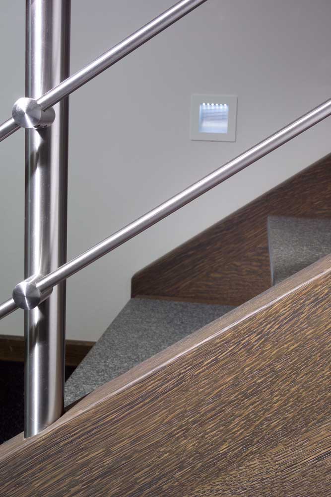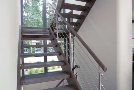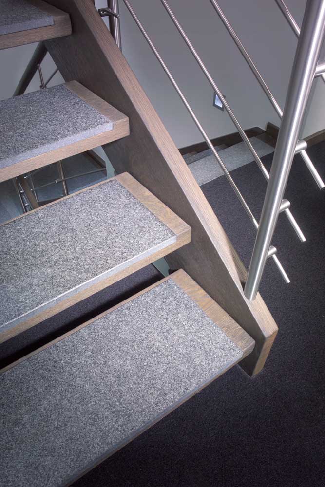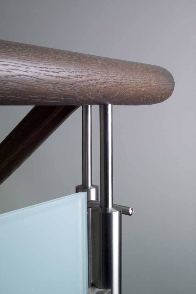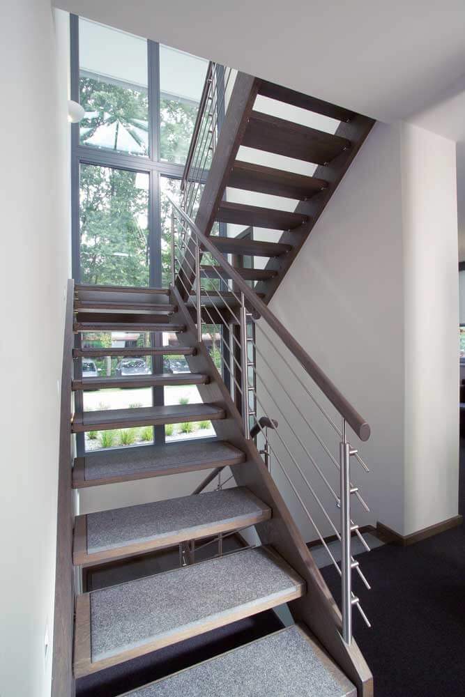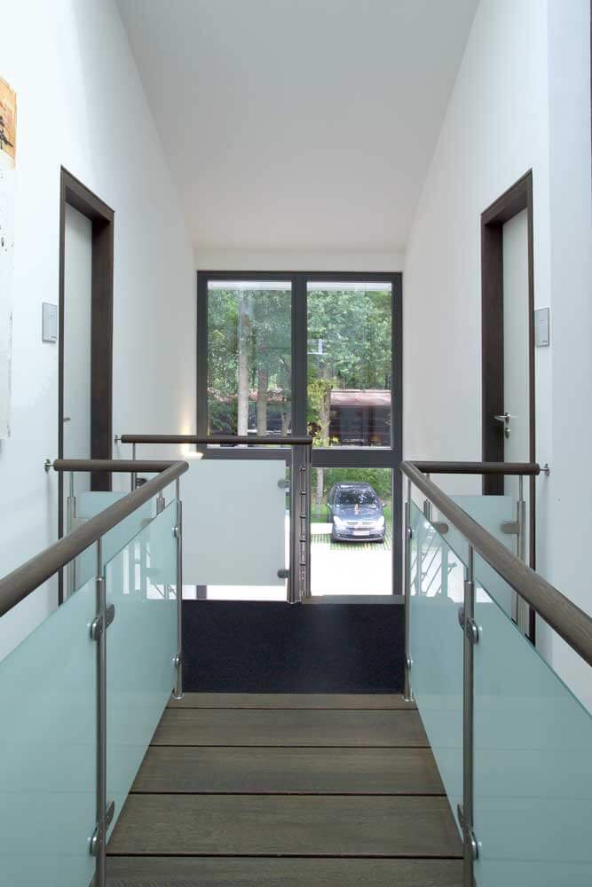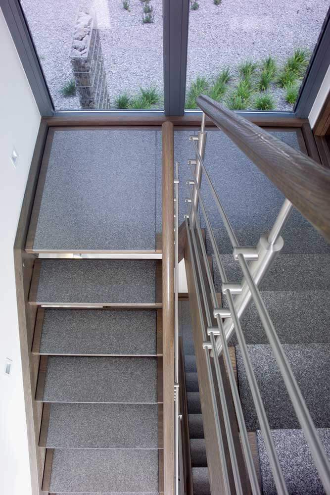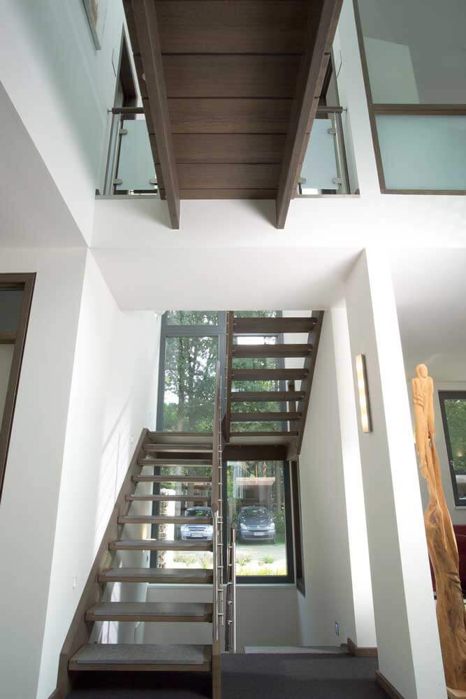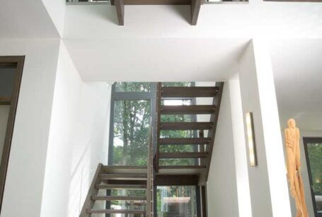 Neben der ohnehin beeindruckenden Podesttreppe mit Massivholzstufen auf Edelstahlbolzen, bietet eine kleine Brücke im Galeriebereich einen besonderen Blickfang. Das Zusammenspiel von Eichenholz, Edelstahl, Glas und Granit bildet hier nicht nur eine einzelne Treppe, sondern eine detailreiche Treppenlandschaft.