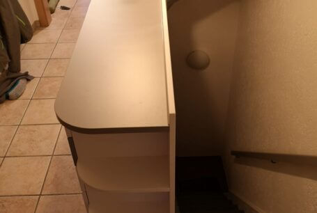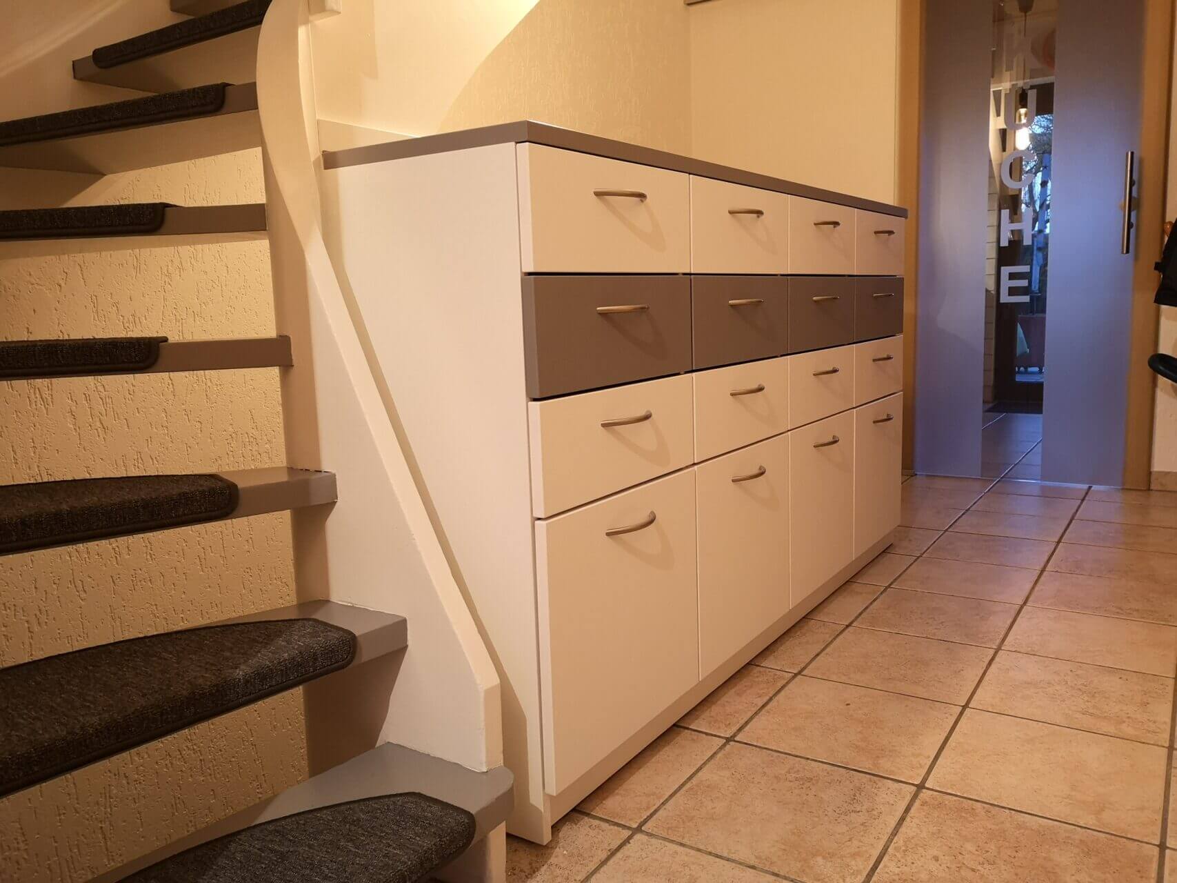 Entstanden ist dieses Schubladen-Sideboard mit viel Platz für Schuhe, Kram und Kleinigkeiten. Unempfindlich, schlank und zweifarbig. Gleichzeitig dient das Möbel als Absturzsicherung oberhalb der Kellertreppe. Ein zusätzliches Geländer ist somit nicht nötig.